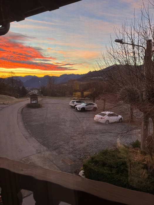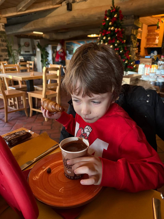 До отеля оставалось всего 20 километров и около получаса езды по серпантинам. Мы были совсем не против - ехать по горам одно удовольствие, хотя слышал и противоположное мнение. На вкус и цвет, как говорится. По мелким городкам и деревням мы доехали до конечной точки нашего путешествия. На ресепшене зачекинились, заплатили, взяли ключи и пошли заселяться. К слову, кому интересно: наш двухэтажный номер 80 кв. м с завтраками на двое суток обошёлся в 400 евро, с учётом скидки 10% от Booking. Зашли в номер: приглушённый свет, деревянные двери, опоры и потолок из сруба, мраморный пол, стены из старого кирпича или камня - именно то, что мы и хотели. А вот младшему сыну, честно говоря, в первый день было страшно. Если уж совсем честно, то и среднему тоже. Он спал напротив камина, а над камином висел огромный череп барана с рогами. Ночью он проснулся, открыл глаза и увидел перед собой догорающие дрова и эту огромную голову. Но уже на второй день дети полностью привыкли к этому вайбу и перестали бояться, а в день отъезда даже расстроились и не хотели уезжать. Так им понравилось путешествие, сам номер и местность, где мы жили.