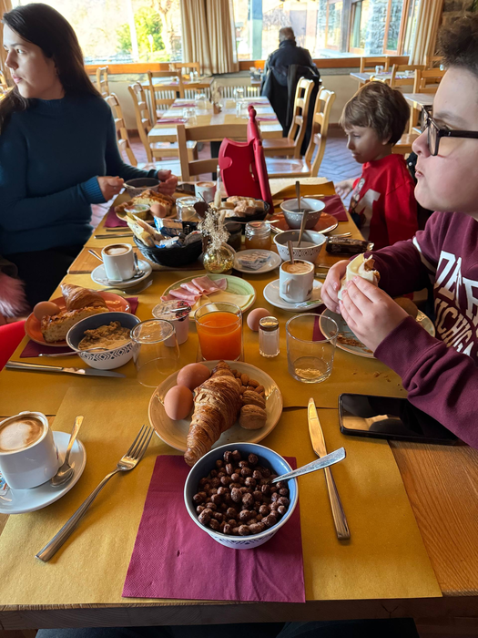 После того как разложили вещи, перед сном сели поужинать за огромным деревянным столом. В супермаркете купили несколько больших наборов суши, нарезку и сэндвичи для среднего сына, потому что он рыбу не ест. Попили чай и разошлись по кроватям «в телефончике посидеть». Самое интересное, что достаточно высоко в горах была хорошая мобильная связь, ловил 5G, а вот Wi-Fi был слабенький. Это единственный минус номера - медленный интернет. Хорошо, что мобильный ловил, потому что, хоть это и отпуск, мне нужно отвечать ученикам: много чатов, связанных с покером, желательно быть на связи.