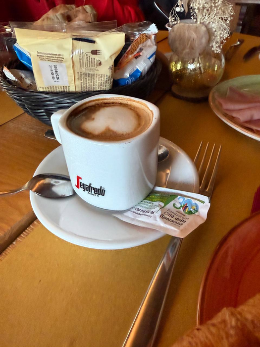 Мы собрались, красиво оделись и пошли в ресторан. Столик нас ждал. Особенность кухни: почти всё готовится в печи на дровах и из собственных фермерских продуктов. В меню возле каждого блюда указаны цифры - аллергены. Цены стандартные для Италии, чуть выше среднего. Стейк 30 евро с гарниром, паста 18 евро, пиццы от 8 до 15 евро за штуку, мясная нарезка 20 евро. Алкоголь мы не пьём, поэтому даже не смотрел эту часть меню, но обычная газированная вода 0,7 в стекле стоила 4 евро, а кола 0,33 - 5 евро. Еда была очень вкусной. Не зашёл только сыр собственного производства - из трёх видов один был норм, второй на 6 из 10, третий с привкусом «козла» на 2 из 10. Зато пицца «4 сыра» была супер. Я рассчитывал на чек до 200 евро, а вышло всего 120-130. Потом пошли в номер есть торт, в котором утром были свечи - что-то вроде чизкейка с лесными ягодами.