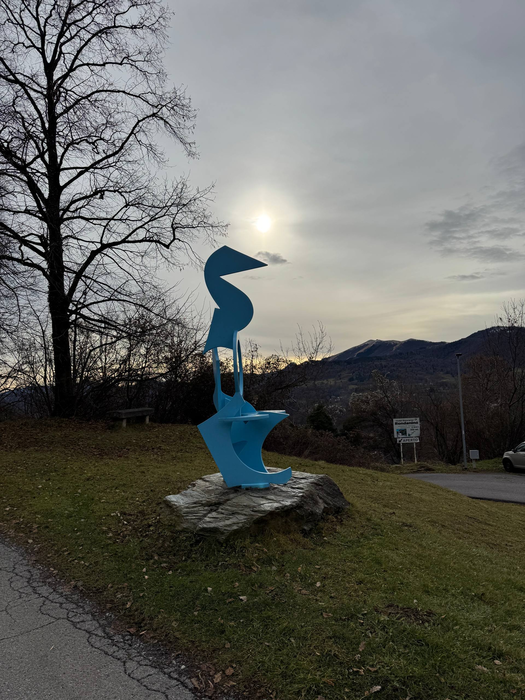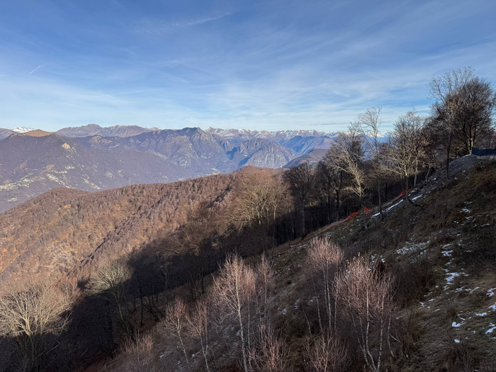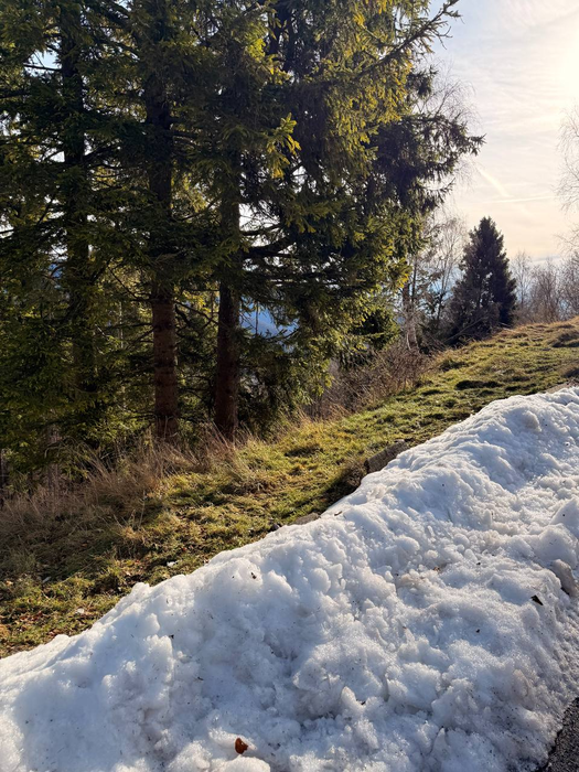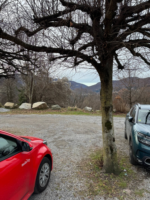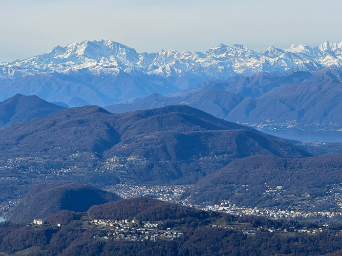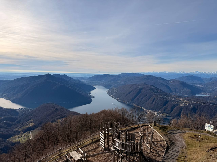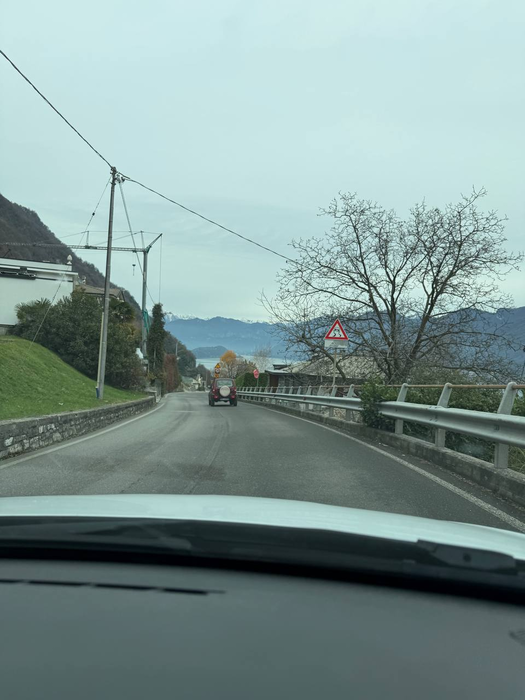 После завтрака мы собрались и поехали на «Балконы Италии» - смотровую площадку на вершине горы, откуда видно Швейцарию, озёра и горы. По дороге по серпантинам пришла СМС: «Добро пожаловать в Швейцарию…». Прикольное ощущение, потому что последний раз границу какой-либо страны мы пересекали почти 4 года назад. Парковка большая, туристов мало - человек 20-30 максимум. Я понял, что то, что мы видели вчера на Комо, так себе по сравнению с видами здесь. Все начали фотографировать и снимать видео. Даже я записал кружок для своего телеграм канала. Он, конечно, сильно режет качество и не передаёт всей красоты, но не поделиться я не мог. Мы вышли на балконы, там стояли бинокли и почти во всех были закрыты линзы, но один оказался с открытыми. Видимо, кто-то закинул еврик до нас и время ещё не истекло. Через бинокль, если честно, не особо интересно, разве что рассмотреть дальнюю заснеженную гору. Ниже была ещё одна смотровая площадка уже со швейцарским флагом - конечно, пошли и туда. Минуту назад были в Италии, прошли 50 метров и уже Швейцария. Потом поднялись на самый пик, там была старинная церквушка, но закрытая. Пока мы гуляли, на парковку подъехала тюнингованная машина - кто-то снимал промо-ролик для мероприятия.