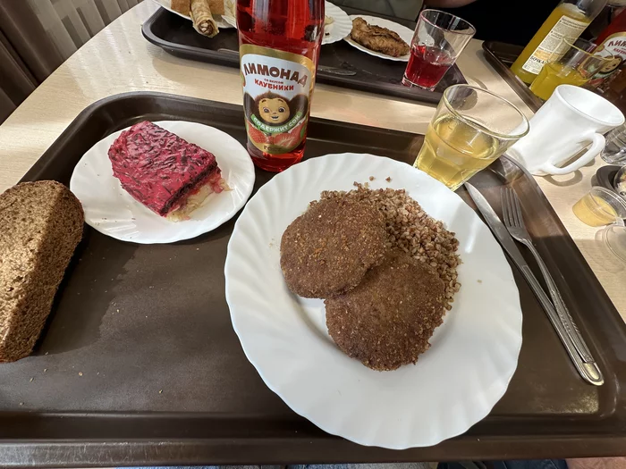 Селедка под шубой, греча с бараньими котлетами, компот, лимонад, хлеб черный. Цена 6 долларов без чаевых🙈 В белой кружке - самогон🙈🙈
