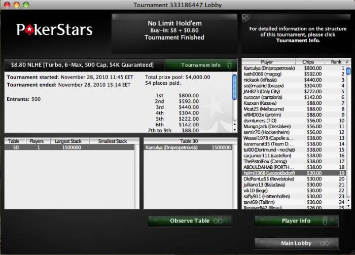 Парочку скринов от меня,ТОП4 в раштурнире за 26$(+519$).И совсем свежий занос TOP1 в 2кг суп.турбо турике за 10$ и +865$ призовых(ровно месяц назал был 3ем в этом турнире,теперь он мне покорился).Тащим потихоньку...