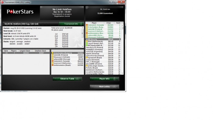 1. Кроме старзов начал много играть на 888 (лотосе), причем весьма успешно. 2. Было несколько приличных заносов: только вчера +1950 на лотосе за топ1 во фризу по 55$. В начале августа заносил топ3 в ребайнике по 8 на ПС, дали тогда 2200. Летом заносил еще 5.50 2р1а на старзах (+1270) Ну и еще раз 7-8 заносил небольшие турики на старзах, давали по 500-900 баксов. Вообще, в плане покера был очень тяжелый год. Сначала, с сентября по декабрь 2011, все шло гладко и хорошо. В интернете все выигрывалось, съездил в оффлайн на РПТ Киев, там ничего выиграть не удалось, зато набрался опыта и получил кучу положительных эмоций. + увидел вживую и поиграл за столами со многими "звездами" российской покерной сцены. Чего стоит только мой стол на гранд эвенте РПТ (Вампирка, Михаил Семин, Сосновый, Фиш2013, Ватер, Николай Чорный). Просто стол смерти какой-то был )))) 3. Но в декабре начался дауннннннн, который продолжался вплоть до мая 2012. За это время успел поиграть в команде Тайнера (вроде бы с февраля по апрель 2012). Но так как даун не отпускал, да еще из-за работы (которую бросать я не собирался, ибо платят хорошо и условия отличные) не успевал на командные занятия с тренером (Сашей "Самородком" Куперманом) то в команде продержался я не долго, и мы по обоюдному согласию решили расторгнуть отношения. Ну а потом, в мае, даунстрик наконец-то закончился, что можно увидеть из моего общего графика из шарка (1600-2700 турнир это декабрь-май, после 2700 - соотв-но май-нынешнее время)
