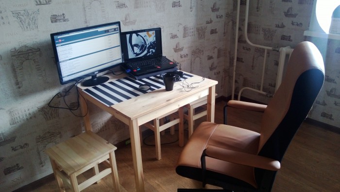 В Кемерово мы снимали двушку, и вторая комната у меня была кабинетом, где я играл..Сейчас мы сняли однешку, поэтому мне приходится ютиться на кухне и мое рабочее место выглядит вот так