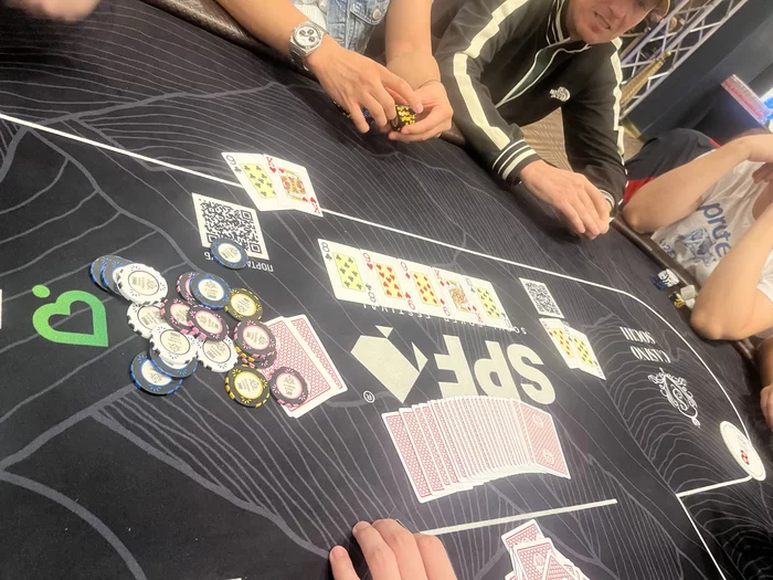 2.5к-5к-5к, утюг нажрался и прокидал фишки, ставит АИ 7к, баунти 1950$ (50% пойдет победителю, 50% в прогресс, получается на руки 975$), следом понимающий репуш 45бб (может быть очень широко) и после долгих раздумий другой понимающий свой репуш 52бб (тут поуже, зато близко к 99% не натс)