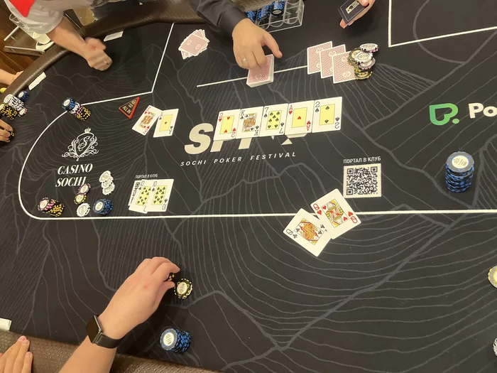 Флоп 899, блайнды чек, рейзер 800, три кола. Крутим 5к, все до эстонца на сб пас. Думал минут пять, кол (после такого планировал уйти в чек по терну но: