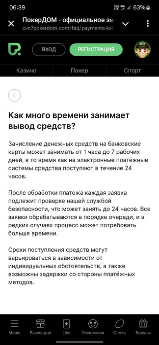 Что делать, если завис вывод? Подождать 24 часа. Обратиться в чат тех. поддержки Покердом или написать на почту и прислать выписку в PDF формате за период, который запросит оператор саппорта (обычно за последнюю неделю).