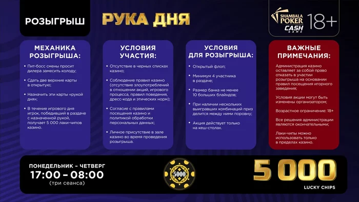 Тут ещё акции всякие на РБ, первый раз за эту сессию выиграл 5к лаки чипов, 3 раза в день только рука дня играет, сегодня надо выиграть раздачу с .