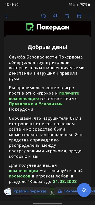 Покердом, Добрый день! Покердом неожиданно заблокировал аккаунт, единственное, что я делал нестандартного - установил на телефон приложение и выбил себя же, залогиненого на пк, тк надо было отойти по делам, затем вернулся обратно и перезалогинился на пк. Поддержка на запросы не отвечает. На аккаунте было ~10к.. Ник Albertporno.