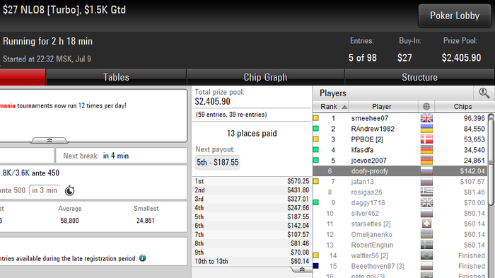 Как-то так. В принципе сегодня оттыграл неплохо, в ребайнике две раздачи ссыграл плохо, но так как начальная стадия была, они особо ничего не стоили. Так в целом занос близок, буду катать и ждать. В ребайнике за 16 вылетел на бабле финалки, .... Есть где занести нормальную сумму, но не дает. Главное что играю в свою хорошую игру. Всем спокойной и удачи