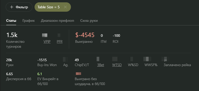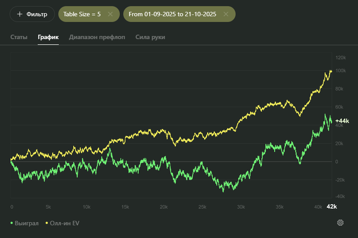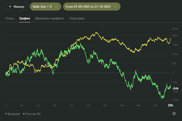 С апреля нет ни дистанции, ни профита. Считай в полугодовом отпуске побыл. Занимался оффлайн делами, решал проблемы, болел (уже писал об этом недавно). Правда теорией всё это время занимался и даже катал по 1К турниров в месяц. Сейчас вот пытаюсь войти в рабочий ритм. Идёт третья попытка шотнуть десятки