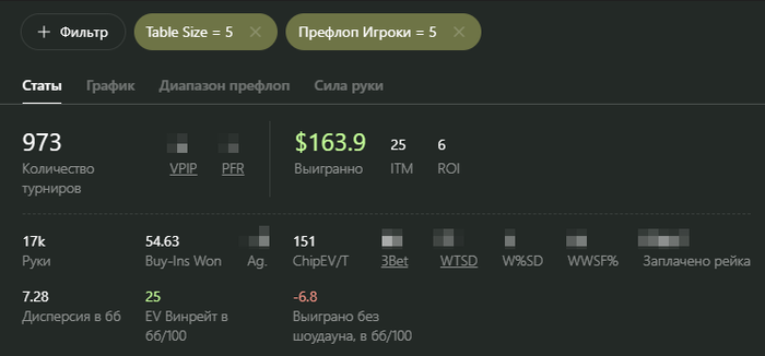 Десятки даются очень трудно. Не знаю как это работает, но для меня 3-й и 10-й лимиты отличаются как небо и земля. В первую очередь, думаю, тут психологический момент: если на 3-ках дисперсия особо не бьёт по бюджету, то на 10-ках - стрики значительны для большинства людей со средним доходом, и уже нужна финансовая подушка и крепкий банкролл. Сейчас работаю над целью показать на $10 лимите: ChipEVT>80, WR>10бб/100, и любой положительный ROI ПреРБ.