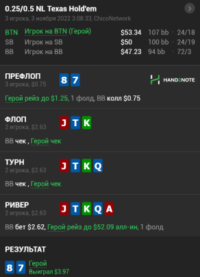 Отыграл на концентрации, но было много сложных спотов, сделал несколько неверных предположений (довольно дорогих). Потом еще игра ускорилась, в итоге еще пару лишних мувов. Короче, на 3 с плюсом отыграл (из ста)
