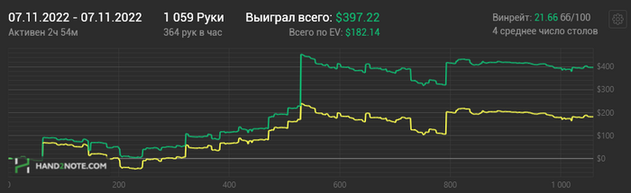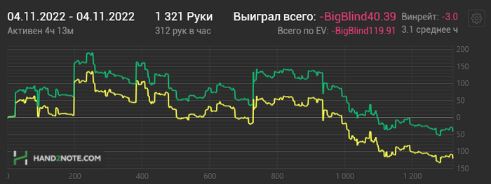 Вчера как раз вспоминал - осень 2021, прошло где-то полгода с момента моего возвращения в покер, я только-только поднялся по лимитам до нл100 и поиграл там чуть. Тогда мне в голову пришла "гениальная" мысль, что теперь надо завязывать с бамхантом и начинать НАСТОЯЩИЙ покер (говносоставы с регами на нл100 старз)