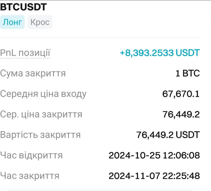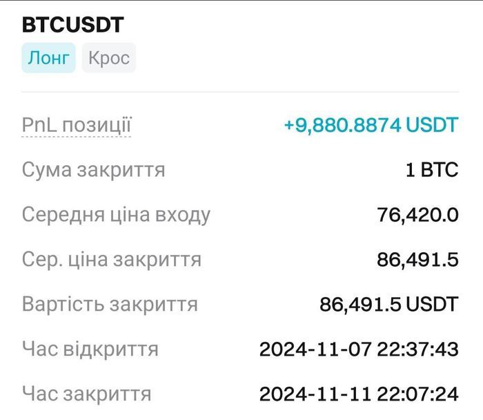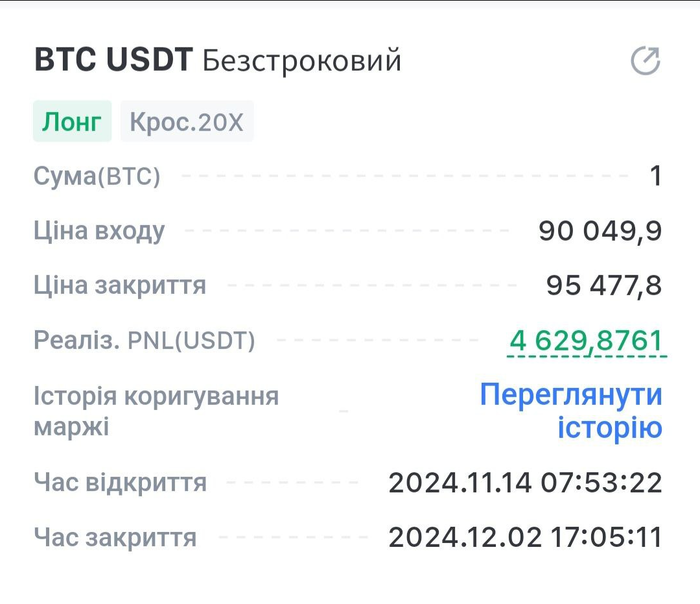 Сейчас этот лонг открытый по цене 90 000 и плавающий доход по нему около +7К (при курсе 97 000).