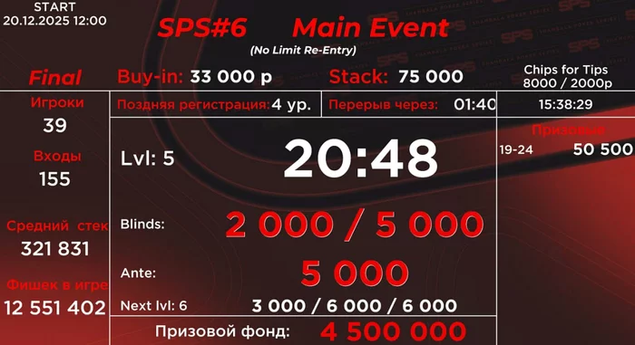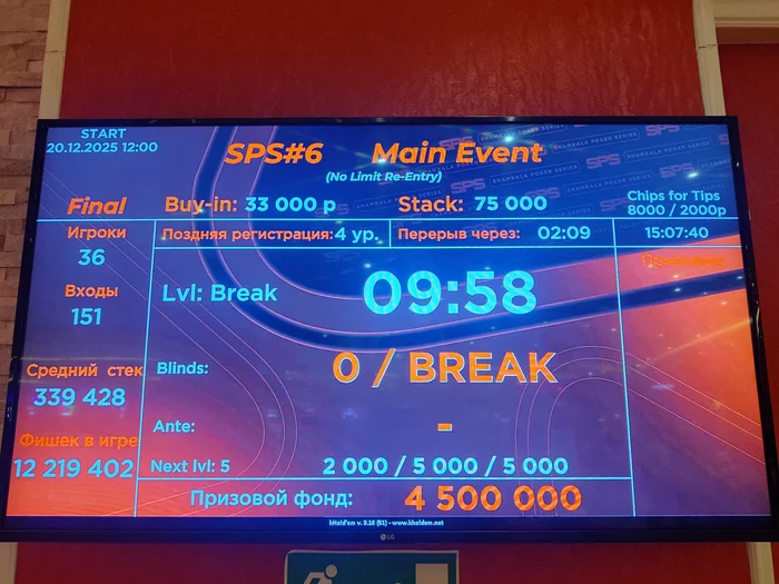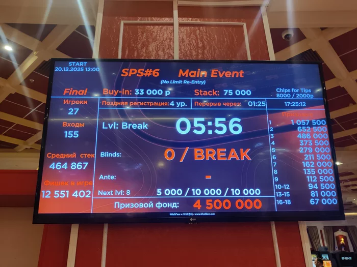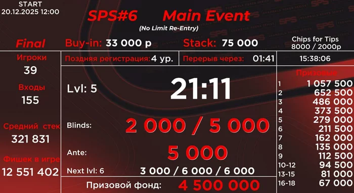 Регистрация закрывается, ни одной раздачи не выиграл за последние пару уровней, стек 485к, в ITM будет 24 из 36 человек на данный момент.