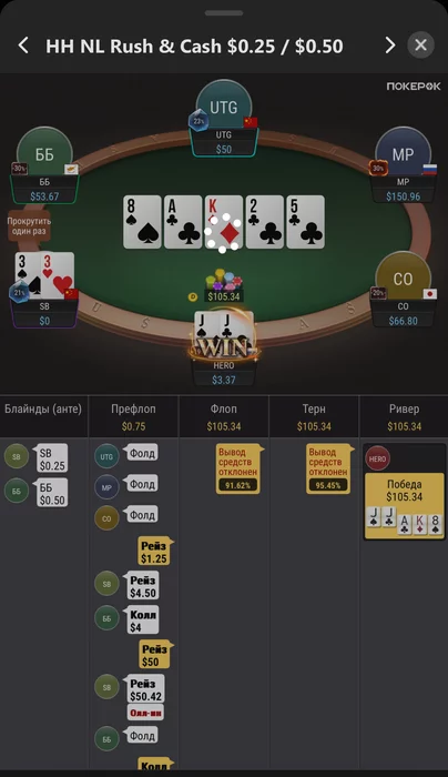 А потом понял, что я всё-таки жёсткий мазохист и извращенец и начал катать в раш энд кэш. Играл мало, всё как всегда -работа +личная жизнь, собственно поэтому и ушёл в быстрый покер ,но тем не менее плюсовал, за год с 50 до 500 наколотил бр. А потом и нл25 начал катать как в старые добрые на старзах. Откатал 50К рук в быстром покере на нл25 С ТЕЛЕФОНА с винрейтом 4бб/100(по ев 3/100,переап я и лакерок,ага).Наколотил 1200 баксов и решил попробовать себя на нл50, откатал пару тысяч рук в ноль,вот собственно с этим багажом и решил написать сюда))Планирую также после работы катать по 500-700 рук, выкладывать сюда интересные раздачки на обсуждение ну и кто знает, может быть всё же когда-нибудь перенесу этот блог в раздел «нл50-нл200 кэш»)).
