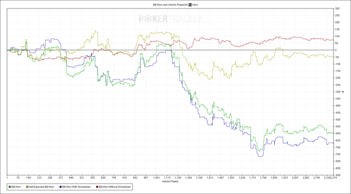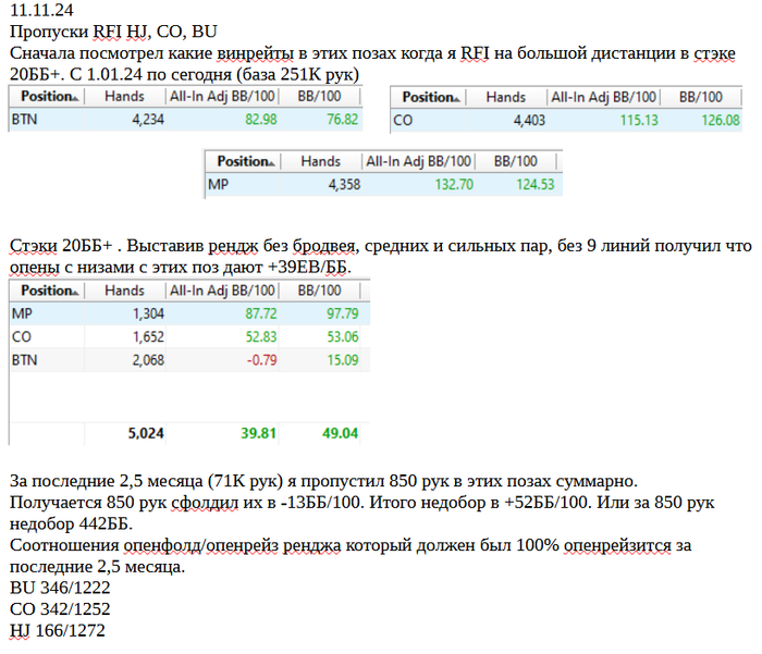 Т.е. на стилловых позициях прям сильно пропускаю почему то. Считайте каждую пятую руку которую должен открыть , не открываю. Посмотрел раздачи, просто тупо опенфолд играю, там даже Axs иногда проскакивают, а разномастных много. Но большая часть конечно какие то мастные коннекторы и гапы, а также низы с бродвейной картой тоже одномастные. По разномастной части норм открываю. Завтра короче буду на этом концентрироваться, это так то довольно много винрейта упускаю. Плюс сегодня позадрачивал тренажер, на нем все вроде неплохо , по 3 раздачи на HJ, CO пропустил и 1 на BU . Значит провтыкиваю во время игры. Может столов многовато (снова ушел на 8-9), летом играл 7-8. Попробую завтра поменьше столов.