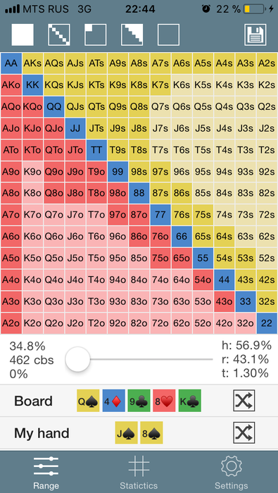 Более подробно мои рассуждения по ходу раздачи описаны в видео интервью выше. Фактически я совершил техническую ошибку и заколол по «флешу», которого не было. В интервью говорил, что был план играть чек-рейзом терн, но если бы я увидел 4 треф (а не пик как было) - просто сдался бы. Это тоже считается в калькуляторе - против его спектра 4 треф для меня хуже по эквити на 1,5% чем допустим К (который разумеется более страшная карта против узкого 3-бета). Поэтому при выпадении других карт (тот же К, например) - я планировал блеф чек-рейз терна.