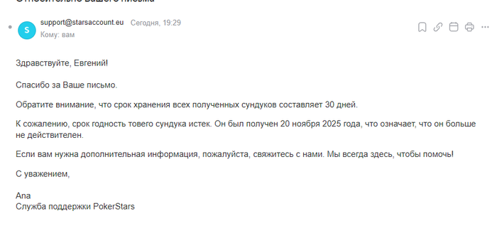Крч говоря общался в лайв чате, по началу прогнозы были не утешительные. По их правилам сундуки сгорают, если не открыл за 28 дней.