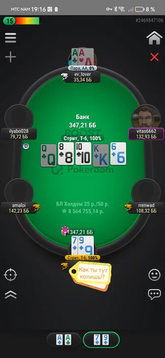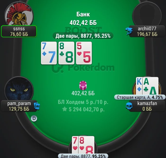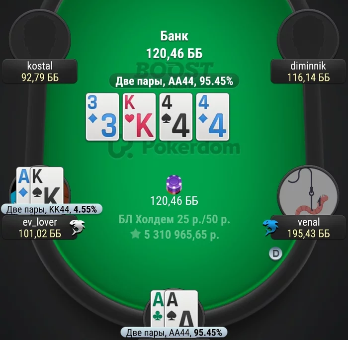 4б пот, почему бы не сыграть 4б пуш на этом флопе с АКо, 🙊🙊🙊, в дипах. Как я его заебал 😏