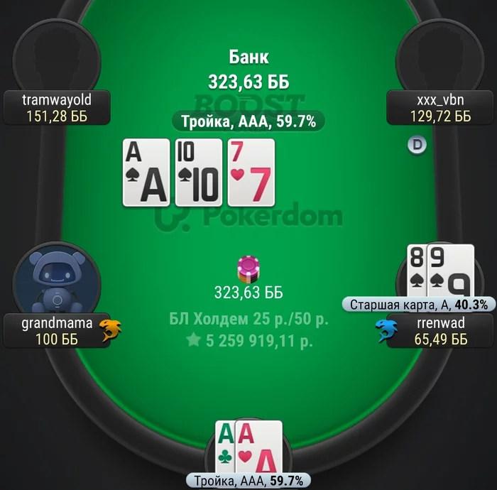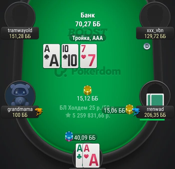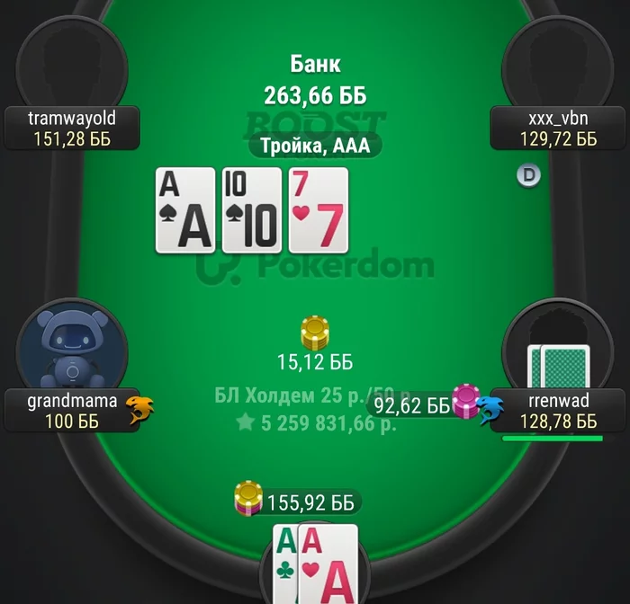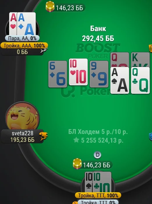 Хотя мысль была такая, фолд будет(сожгу эквити оверпаре с крестой) либо колл и я проигрываю, увидел колл, вздохнул, в дипах в фулл въезд, бывает. А вколили даже не тузы с крестой.