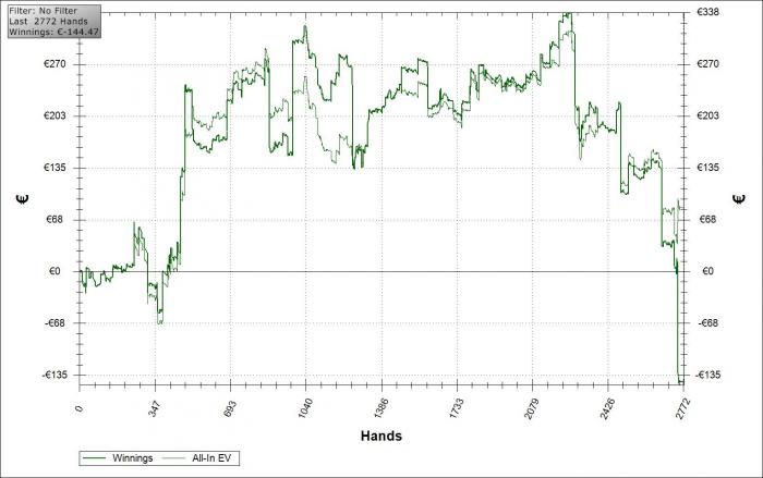 На удивление прилично было фишей, поэтому пришлось подстраиваться и слегка затайтиться. Хотя знал бы, что каждый фиш на нл100 этим вечером будет считать делом чести меня раздеть, не менял бы ничего. Спасибо регулярам, что не бросили в трудную минуту и слегка делились патронами.