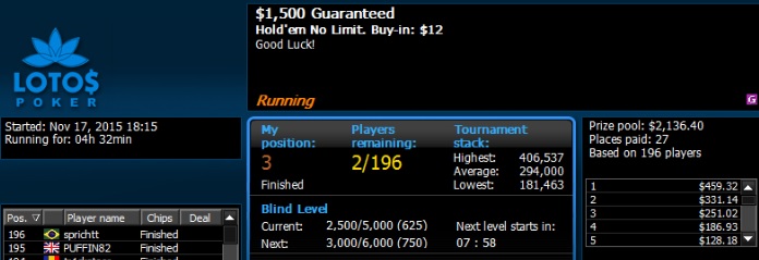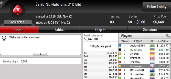Poker Stars, $20 Buy-in (250/500 blinds, 60 ante) No Limit Hold'em Tournament, 6 Players