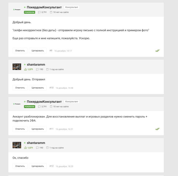 Добрый день. Написал в поддержку, на всякий случай продублирую сюда, потому что в тот раз отлично помогли с проблемой. Необходимо отключить на моем аккаунте на покердом 2ФА. Направил на Вашу почту сообщение с чем связано и фото паспорта, как было указано в инструкции.
