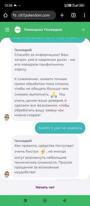 ПокердомКонсультант, цитата "Если вам не ответили в течение какого-то срока (3-4 дня сейчас, в обычное время 12-24 часа)," — Онлайн-чат не работает. Это факт. Там у вас сейчас глупый ИИ и постоянно нет оператора. И вы признали, что допускаете задержку до 3-4 дней на ответы на почту. По моей практике там минимум от 7 дней, ну да ладно.
