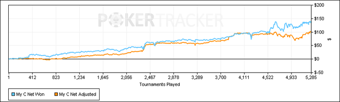Я сыграла в спинах на 0,25/1/2 всего 850 турниров, за это время у меня были просадки по 30би при разнице с чип ожиданием в 45 баксов( на единичках).