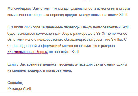 ️❗️Для пользователей из РФ и Беларуси с 1 июля 2023 года изменятся комиссии за переводы между аккаунтами Skrill: - для обычных аккаунтов, в том числе True Skriller = 5,99% (минимум €5) - для VIP Silver = 2,5% (минимум €5).
