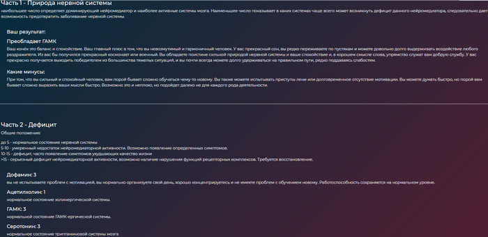 наибольшее число определяет доминирующий нейромедиатор и наиболее активные системы мозга. Наименьшее число показывает в каких системах чаще всего может возникнуть дефицит данного нейромедиатора, следовательно дает возможность предотвратить заболевание нервной системы.