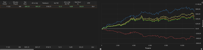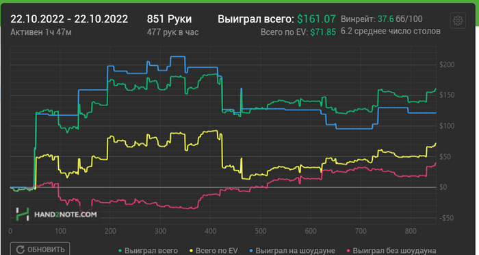 Я всё больше убеждаюсь, что пати немного заряженный рум)) покрайней мере у фишей бывают "счастливые часы", и на всех столах всех регов ушатывают. Ну настолько нереально происходящее, что ГГ с их натягивающимися риверами просто в сторонке отдыхают. В такие моменты просто закрываю столы. Сегодня закрыл слишком поздно и получил минус 5 баинов в последние 10 минут сесии