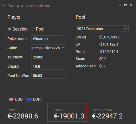 но даже с 100% x1000 в пуле получается с 22.4 фишки 9-10к евро за месяц за 25к турниров (в калькуляторе вбил), а это ~40 евроцентов с турнира, в целом хорошо, на старзах с 40% челенжем выходит около того же у регов 25 флешей, но там не нужно влезать в лидерборд гонки постоянно