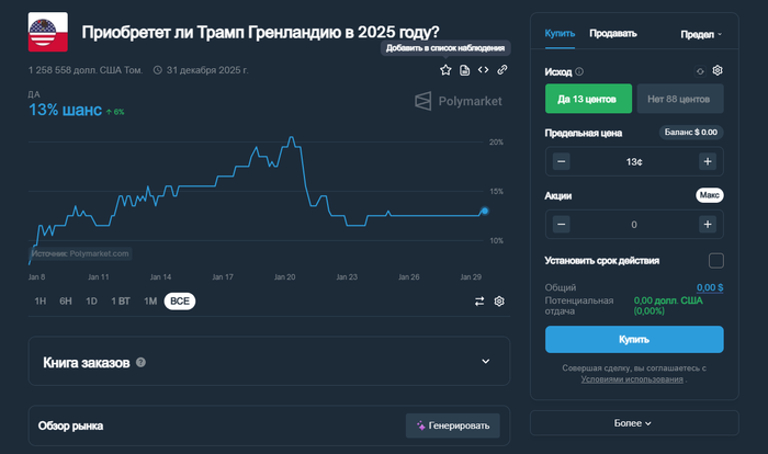 Последний раз передача земель на договорной основе происходила 200 лет назад, и я абсолютно не верю в то, что Трамп может приобрести Гренландию. На 20 января можно было поставить деньги на "НЕТ" с кф 1.26 - и мне кажется, что это просто легчайшие деньги в мире.. Будь я чуть внимательней, я бы грузанул 80% своего капитала на данное событие, и был бы этому несказанно рад. Но я не успел :) Сейчас кф на "НЕТ" = 1.13, и с такими условиями я не готов замораживать финансы на целый год.