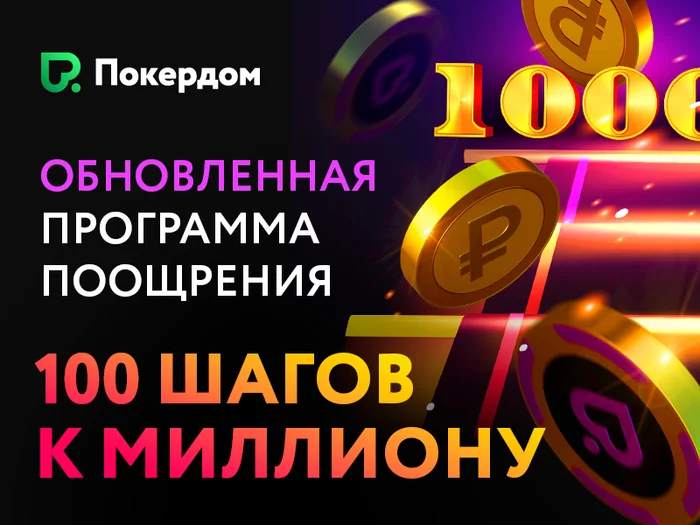 Мы рады представить нашим клиентам обновленную программу поощрения для всех игроков в покер «100 шагов к миллиону 2025». Просто играй в покер тогда, когда хочешь – и получай разнообразные денежные призы за каждый пройденный уровень! За достижение последнего (100-го) уровня тебя ждет особый подарок – возможность побороться за 1 000 000 рублей!