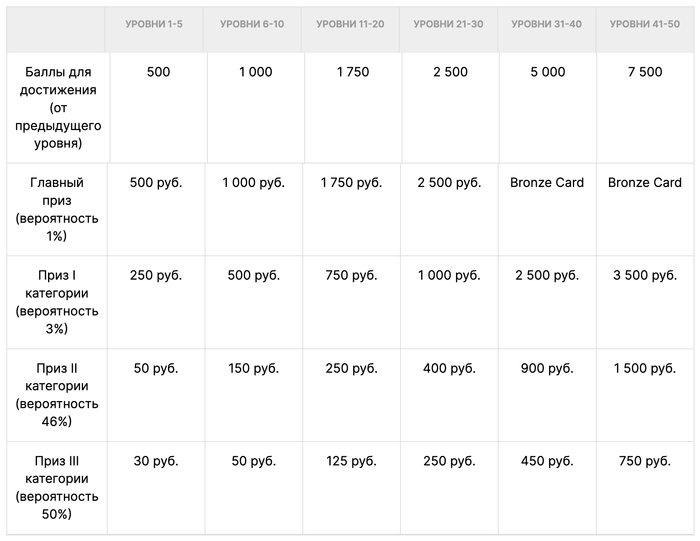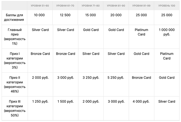 Таблица возможных призов для специальных карт (бронзовая, серебряная, золотая и платиновая) с указанием вероятностей их выпадения: