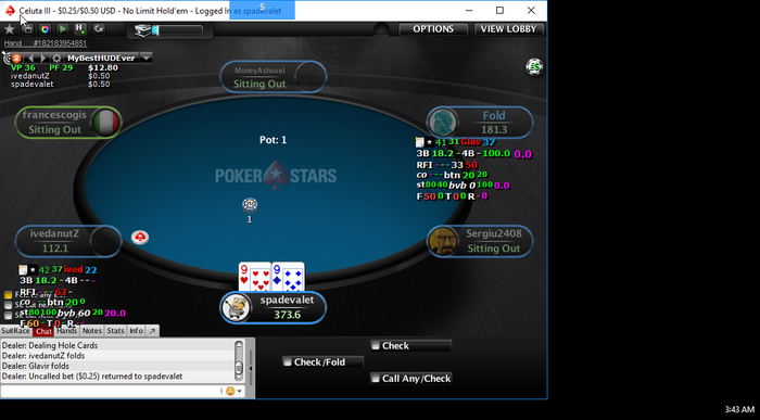 > There are the screenshots showing that regular player Sergiu2408 went to sit out every time when recreational player francescogis ran out of chips.