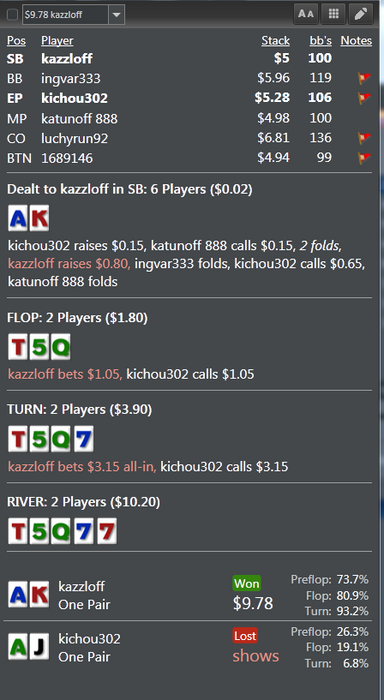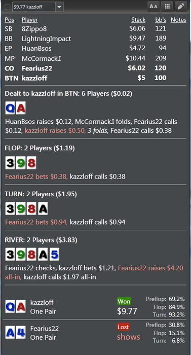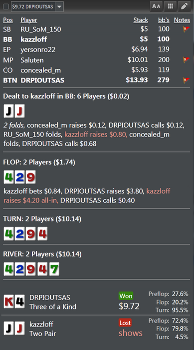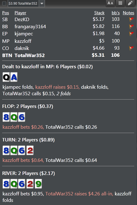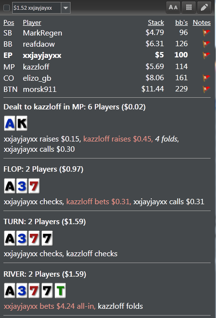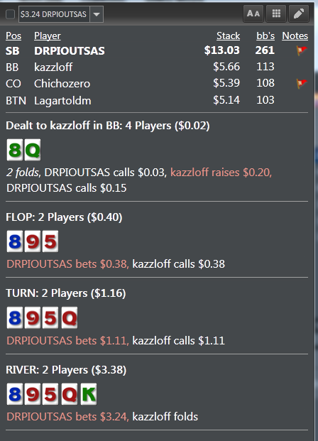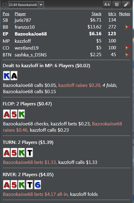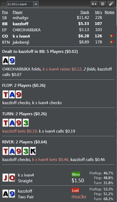 В следующей тоже решил вскрыть агрессивного,показалось странным его чекбек на флопе.