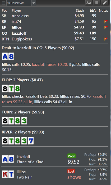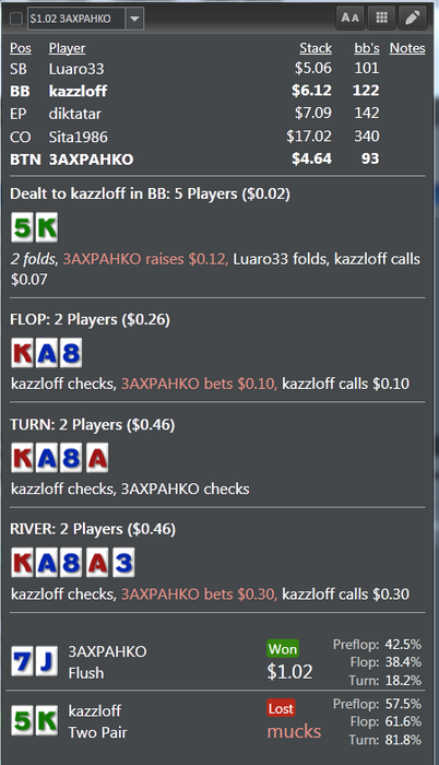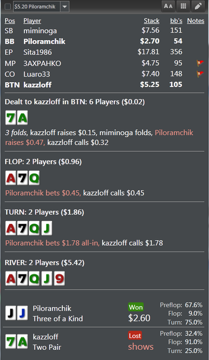 И это не в плане результата. Появилась некоторая усталость возможно. Стал проявляться тильт "заебало меня уже выыкидывать". К тому же ,за эти 3 недели в какой то степени разметил поле и как то так выходит,что и игру теперь сложно находить. Кругом говонореги,ниты типа меня ,только со своими тараканами в голове. Малоприятно играть против такой компании. Да и против фишей и випарей зачастую играть не легче. Проиллюстрирую как всегда раздачами.