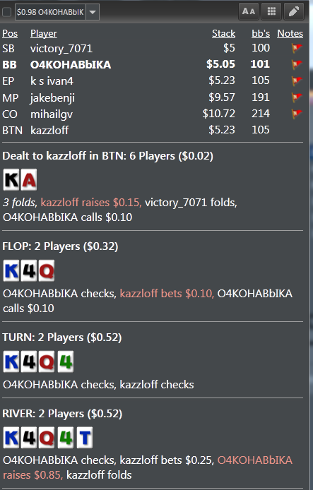 В следующей играю снова против фишеподобного и решаю вернуться в 2010-й и сыграть легко и беззаботно тптк в три барреля. На ривере что то пошло не так,и я,подумав полторы секунды,просто выкинул. Ну там же блефа просто нет в теории на рейз ривера?