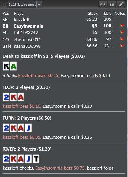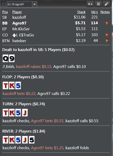 Тут не знаю почему не ставлю терн и решаю ставить ривер,возможно запутал и себя и оппа,хотя он довольно нитовый вроде.