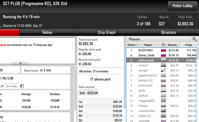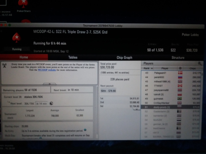 Неплохой еще один день)) Неужели я научился играть в покер. Выиграл сат за 7 баксов в оманию пло и тащанул ее)) Так в целом я играл неплохо, но в некоторых моментах можно было и лучше. Под конец сессии чутка расслаблено катал. Надо после сна собраться и скатать снова хорошую сессию. В омании 55 показалось поле хорошим, но мне говорили что там большинство регов играют как фиши и ты заблуждаешься, так что спорить не буду. Омашку буду поигрывать дешевую. Понравилось катать много столов, надо будет все время так катать. И не скучно тебе и хорошо. Надеюсь этот запас мне поможет легче переживать даунстрик. Всем спокойной и добрых. Удачи
