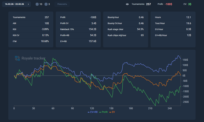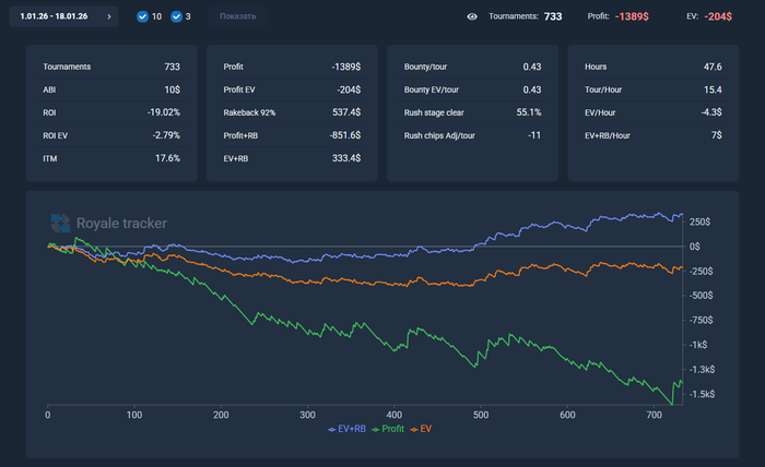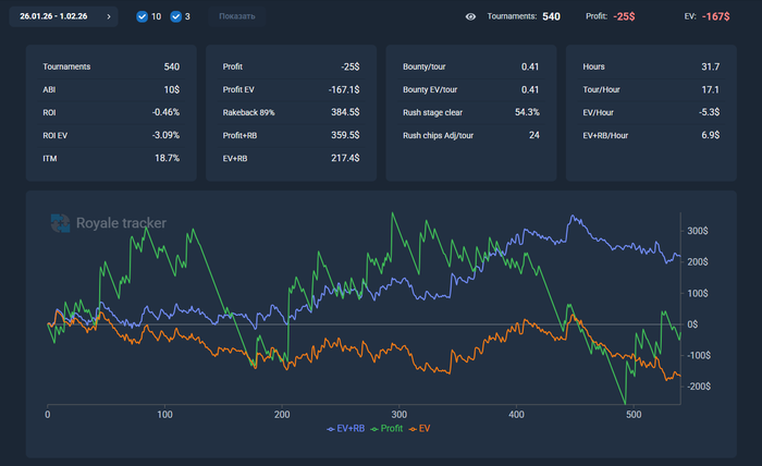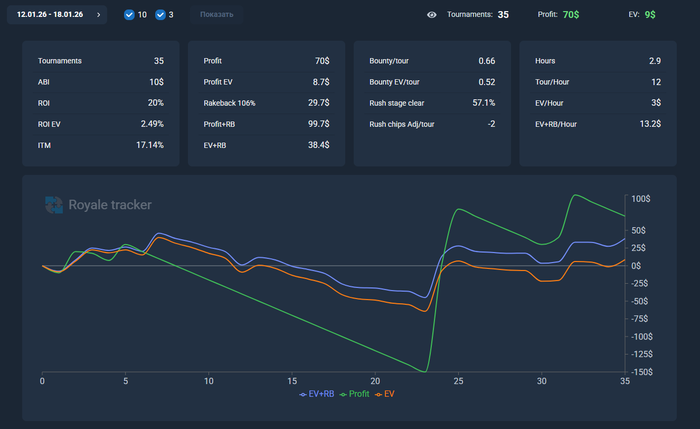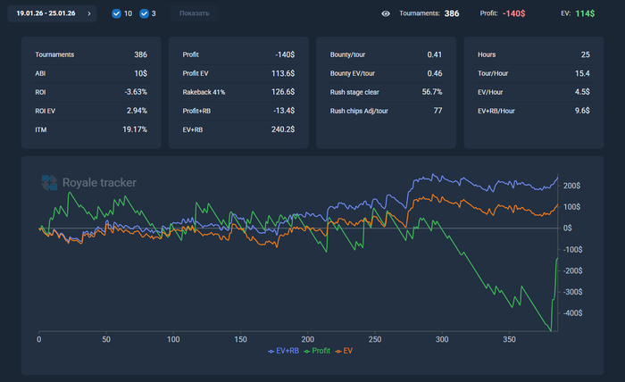 📝 Неплохая неделя: по ЕВ +240$, по кассе - ноль (недобор растёт); ROI EV и Rush Chip EV/T - выглядят достойно; дистанция не гриндерская, но уже что-то; рейкбек - 41% (часть не вошла в расчёт). Учитывая марафон - отработал на твёрдую тройку. Но нужно наращивать объёмы, и если не получилось вписаться в гринд рывком, то буду это делать постепенно.