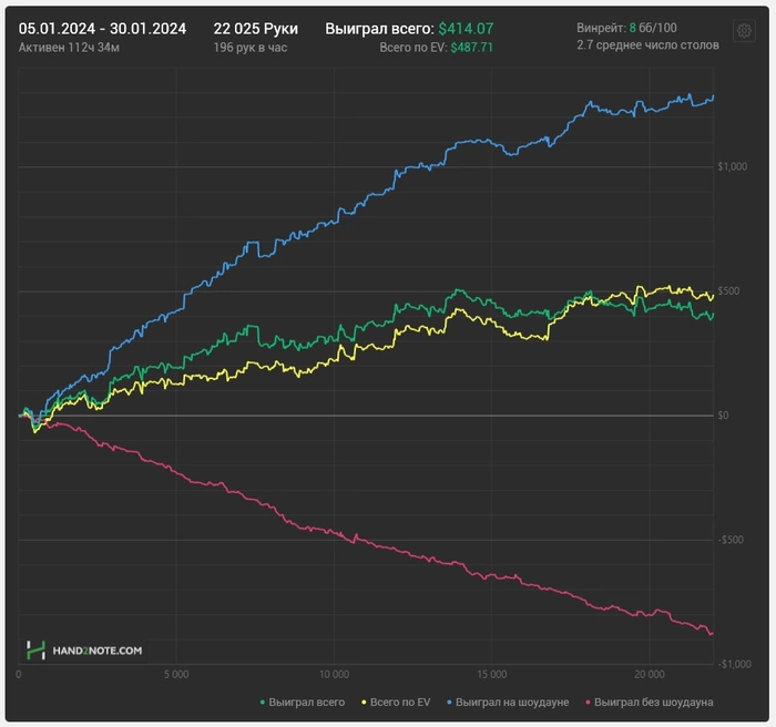 A8444 @ 31.01.24Январь.. Вроде как месяц прошел успешно, если не считая последние 10к рук, которые были на грани тильта ) Получил первую выплату, но в крипте, а я хз как ее выводить, так чтоб не жахнули.. говорят что часто блочат банковские карты за п2п переводы..