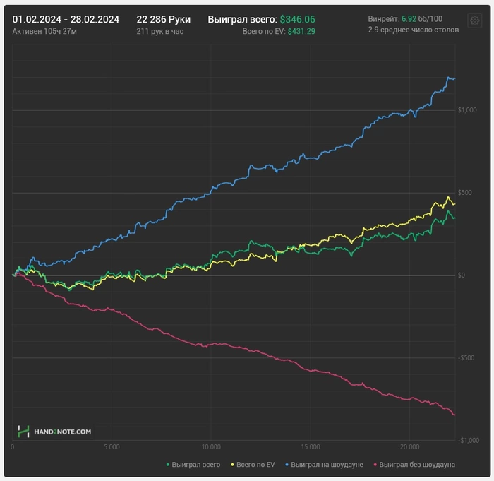 Февраль.. Я в плюсе.. ))) К двадцатке вроде привык, но все что выше, пока не понятно и селектить их не особо получается. Казалось бы, какая разница между селектом нл20 и нл50, как будто никакой, но разница чувствуется, по крайней мере в концентрации фишей, но может я ошибаюсь. Что еще происходило.. была треша с психологом, на тему того, что я всегда через не хочу, иду катать, с чувством тревоги, и избегаю роста по лимитам.. Рекомендации, задавать себе вопросы, получать ответ и анализировать их, адекватные они, или надуманные.. По росту по лимитам.. создать противовесного конкурента, в виде дорожной карты, которую желательно успеть сегодня дорисовать, что бы Март стартовать с ней. По теории.. изучал игру против фишей и разбираю ранауты тернов БУ вс регов на ББ. По ощущениям делаю это не эффективно, так как я так и не придумал, как эффективно записывать результаты, но движуха идет и какая то польза точно есть. Вобщем такие дела )