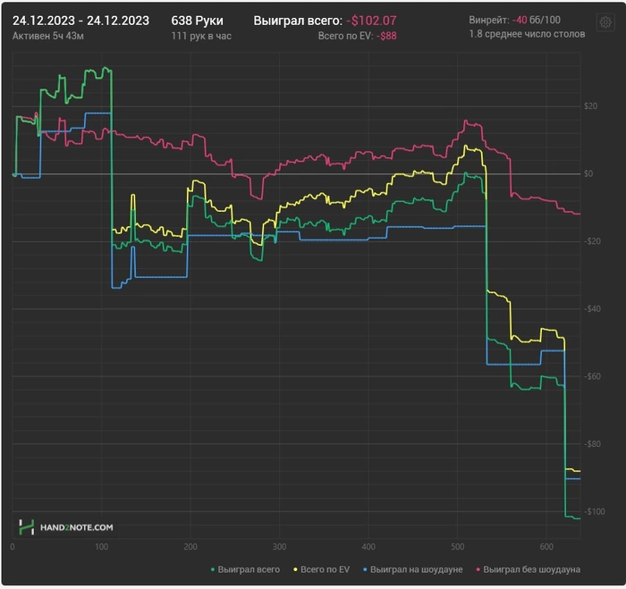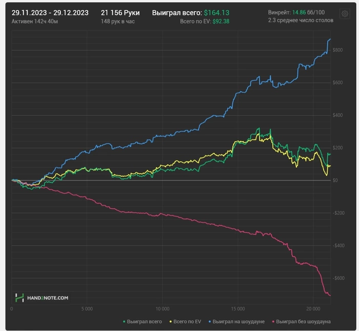 Январь.. Вроде как месяц прошел успешно, если не считая последние 10к рук, которые были на грани тильта ) Получил первую выплату, но в крипте, а я хз как ее выводить, так чтоб не жахнули.. говорят что часто блочат банковские карты за п2п переводы.. короче пока не понятно что с этим делать. Но так как не вывел, то что делать ? Правильно, идти трейдить хаааа, зашел на пике, немного в минусе... ))) По приложухам.. уже вроде как привык, и даже получилось увеличить рук в час. Но по прежнему не приспособился к удобной катке. У меня хоть и два моника, но все равно не удобно. На основном монике, я катаю три стола, на втором остальные эмули, которые лежат друг на друге. Если открываю дополнительные столы на втором монике, начинаю не успевать, и пропускать какие то игровые моменты, где то бетнуть, где то заметить, где кто открылся и тд. Кстати, Старзы меньше сил отнимали, чем приложухи, в приложухах ты постоянно в движение, а если еще и фризят они, еще больше драконит.. но и конечно я же на старзах играл фулринг, а тут еще и 6макс, которые так же больше требуют энергии ) По теории.. ну я пытаюсь что то делать, но если честно, то очень мало энергии остается на это, после катки.. По скилухе.. потихоньку знания прибавляются)