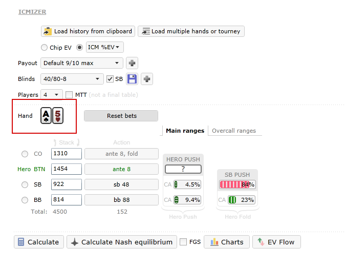 Для того чтобы это посчитать, нам нужны стеки, блайнды, выплаты и диапазоны пушей для всех игроков. Вы можете использовать функцию расчета Движения EV, чтобы увидеть, как математическое ожидание перемещается за столом от игрока к игроку. Обычно можно заметить, что турнирная доля уходит от игроков на блайндах, и перемещается к игрокам в поздних позициях. Также можно заметить, как оно утекает от средних стеков к большим стекам.