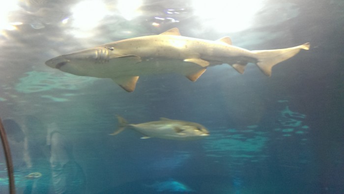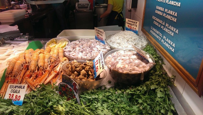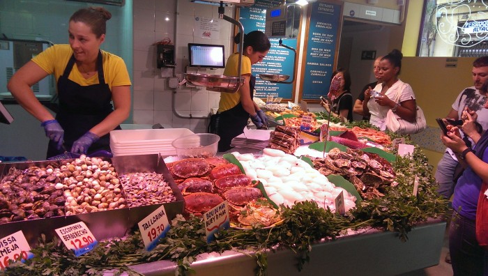 Очень красиво, только... пятисотметровая очередь. Я не преувеличиваю! Посмотрели на это дело, на то, что вход по 20евро - и пошли дальше. Во многих местах Барсы, в основном, конечно, возле достопримечательностей, есть бесплатный вайфай Barcelona Wifi. С помощью нено я нагуглил отличный ресторан морепродуктов La Paradeta. По Барсе их пять штук. Работают 13-15 и 19-23. Вот такие странные часы работы. Зато! Как это выглядит: большая очередь (мы пришли к открытию, и там уже стояло 10 человек), на льду лежат свежайшие мореподукты. Ты подходишь, говоришь, что тебе нужно и сколько по весу, тебе насыпают и отправляют на кухню. Как только твой заказ готов - называют номер столика и ты в окошке забираешь заказ. Такая себе столовка. Очень вкусно и относительно дёшево. Если бы не выпендривались, покушали бы на двоих на 40 евро. Потом поехали в аквариум.